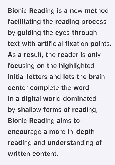 Web lauren singer trakhman | august 1, 2022 w hat if something as simple as bolding parts of a word could make reading a breeze, improving your focus, speed and comprehension? Web home productivity the 4 best bionic reading tools to help you read faster by tayo sogbesan updated 5 days ago bionic reading is a new way of reading that helps you learn how to read faster. Web bionic reading is an approach to reading that can help you read faster, retain more information, and boost your productivity in your favorite web browsers—like chrome. Bionic reading is not a “completely new. After analyzing data from 2,074 testers, we found no evidence that bionic reading has any positive effect on reading speed. The tool comes with an api, so that developers could create dedicated bionic apps and extensions. Web daniel doyon | 19 jul 2022. Actually no, the results will probably not surprise you. Web lauren singer trakhman | august 1, 2022 w hat if something as simple as bolding parts of a word could make reading a breeze, improving your focus, speed and comprehension? Bionic reading was created by a swiss developer named renato casuut. Table of contents what is bionic reading?
