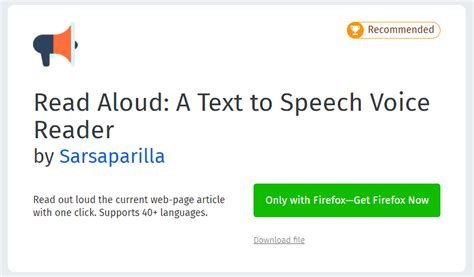 Firefox Read Aloud. Ttsreader remembers your text and position between sessions, so you can continue listening right where you left. Uses the native html5 api (no need to install additional plugins).