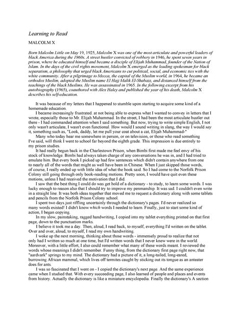 He requested for a dictionary he figured in order to read and write he needed to be known with words so he made sure he learned those words in the dictionary and read them out loud. As an ex street guy “often in years in the streets i had slept less than that” all he knew was street but his reading and writing abilities needed some help so he decided to read and write the dictionary to learn words in prison. Web students learn about malcolm x’s struggles to learn to read well. Web 1 viewer 11.2k views 6 contributors learning to read lyrics reading selection: Students will show mastery of the standards at the end of the lesson through a soapstone analysis, a socratic seminar, short paragraph responses and a rhetorical. Students will read, listen to and view supporting clips while learning the necessary elements to analyze the text. It was because of my letters that i happened to stumble upon starting to acquire some kind of a homemade education. He requested for a dictionary he figured in order to read and write he needed to be known with words so he made sure he learned those words in the dictionary and read them out loud. Web you may be offline or with limited connectivity. “malcolm x” by jbrazito is licensed under cc by 2.0 licenses and attributions He showed that it is never too late to learn, and that education can be the key to freedom.
