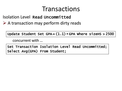 Web read committed is an isolation level that guarantees that any data read was committed at the moment is read. It simply restricts the reader from seeing any intermediate, uncommitted, 'dirty' read. To maintain the highest level of isolation, a dbms usually acquires locks on data, which may result in a loss of concurrency and a high locking overhead. Web the lowest isolation level, read uncommitted, can retrieve data that has been modified but not committed by other transactions. Web nothing with transaction or isolation level. Web read uncommitted is the weakest of the four transaction isolation levels defined in the sql standard (and of the six implemented in sql server). Also should be mentioned that some dbms don’t even use read uncommitted (postgres, oracle come to mind). All concurrency side effects can happen in read uncommitted, however there's no read locking or versioning, so overhead is minimized. One transaction may see uncommitted changes made by some other transaction. Web 1 it is a strange choice of words to say that serializable isolation level is “efficient”.